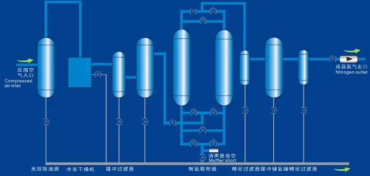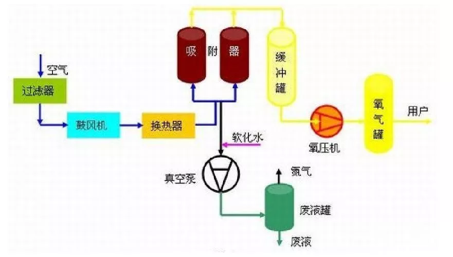 核心原理:利用特定吸附剂(主要是沸石分子筛)在常温下对不同气体分子吸附能力的差异(优先吸附氮气、水汽、CO₂)。空气经压缩机增压后进入装填有分子筛的吸附塔。在高压吸附阶段,氮气等强吸附组分被分子筛捕获,相对不易被吸附的氧气(及氩气)则穿透吸附床层作为产品气输出。当吸附剂接近饱和时,系统切换至低压(或真空)解吸阶段,释放被吸附的氮气等杂质,使吸附剂再生,为下一个吸附周期做准备。通常采用双塔或多塔系统,通过程控阀门实现吸附、解吸、均压等步骤的循环操作,连续产出氧气。