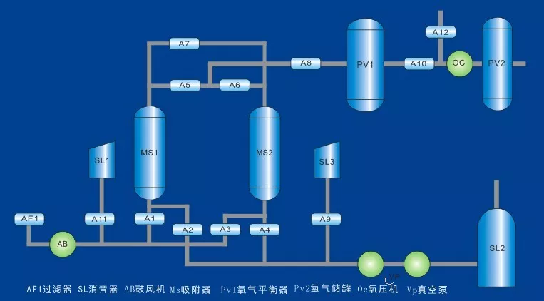 核心原理:PSA技术的改进型。核心区别在于解吸阶段不仅降压至常压,还利用真空泵将吸附塔抽至负压(通常0.3-0.6barabs),更彻底地脱附被吸附的氮气等杂质,显著提高吸附剂的再生效率和利用率。这使得在较低的吸附压力(通常1.2-1.6barabs)下就能获得更高的氧气回收率和更大的单机产能。
