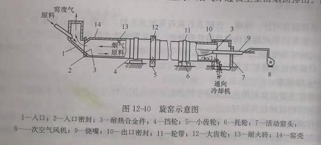 旋窑(回转窑)如图12-40所示。其窑体横卧,与水平成3%-5%的倾斜角,窑体转动速度为每分钟0.5-2转,炉料随窑体转动而向前移动,并自动翻转搅拌以保证受热均匀。窑体为圆筒形,外径约2-5m,长约25-200m,用耐火材料砌的内衬厚150-200,mm,可用钢板焊接或铆接。