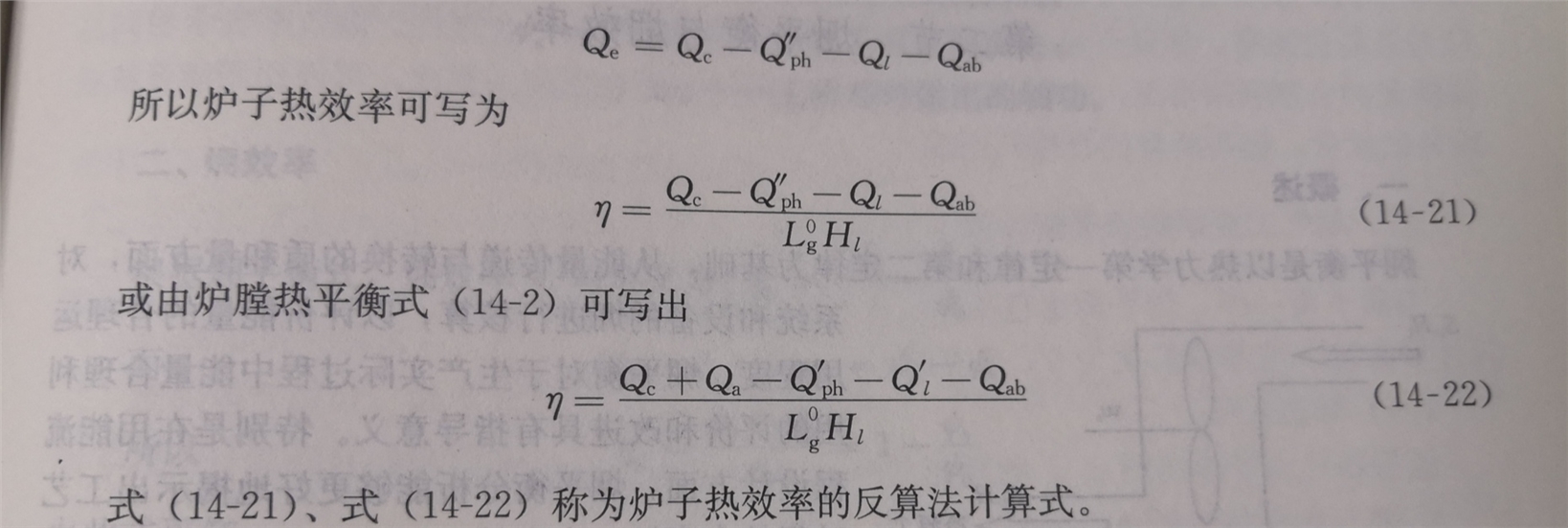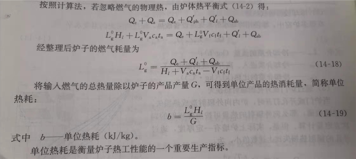 *指出,直接计算法只能求得炉子的热效率,但不可能用来研究和分析影响热效率的各种因素,以寻求提高热效率的途径。为此,在实际测试过程中,往往先测出炉子的各项热损失,反过来计算炉子的热效率,这种方法称为反算法。将热效率公式改写,忽略燃气、空气的物理热时,由炉子热平衡式(14-4)得:
