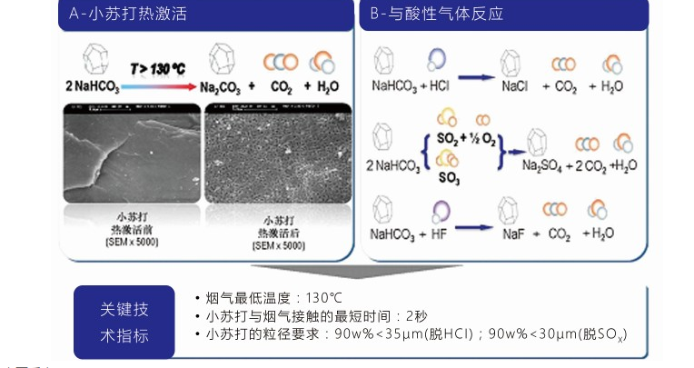 从工业窑炉烟道取出的烟气(烟温230℃)进入SDS脱硫除尘系统。烟气首先进入SDS反应器,在SDS反应器内喷入碳酸氢钠超细粉,碳酸氢钠超细粉在高温烟气的作用下分解出高活性碳酸钠和二氧化碳,活性强的Na2CO3与烟气中SO2及其他酸性介质充分接触发生化学反应,被吸收净化。