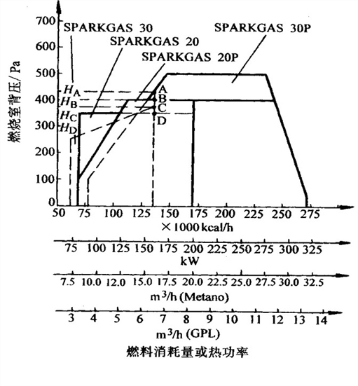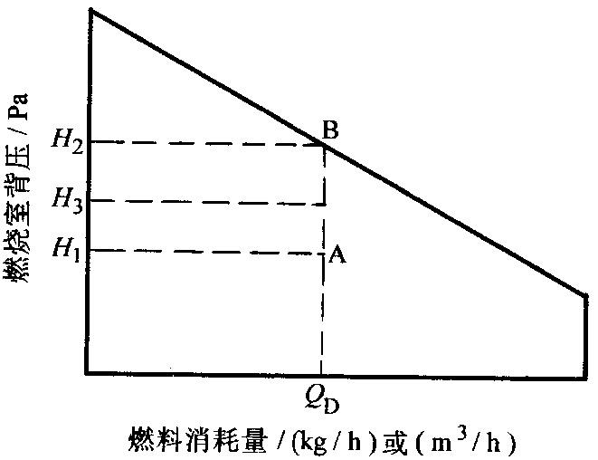 从图中可以看出,燃烧器 A 所对应的燃烧室背压 H比燃烧器 B所对应的燃烧室背压 H低。此时到底选择燃烧器 A 还是燃烧器 B,就要看其背压 H 能否满足锅炉的要求。燃烧器 A、B 的价格可能相差几千元或更多,显然在能够满足工作要求的情况下,我们选择 A 而不是 B。如果 A不能满足要求,B 能满足,就要选择 B。一般来说,立式烟管锅炉要求的燃烧器背压最低,设计合理时,100Pa 即可正常工作;中心回燃式就要高一些;最高的则是传统三回程锅炉,可达 1000Pa 以上。
