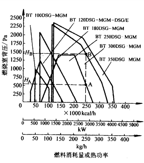 如图2 所示,在利用工作特性曲线选择燃烧器时,常有同一燃油消耗量有两种型号的燃烧器曲线与之对应。