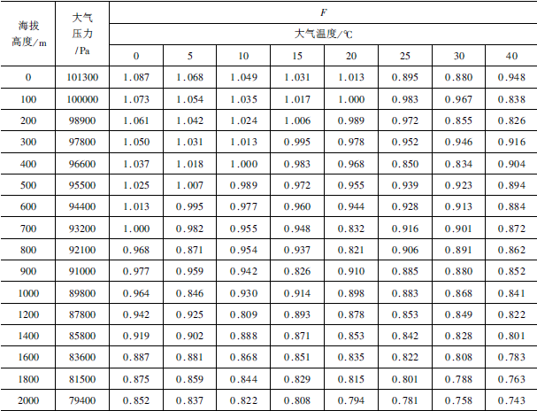 1)首先根据空气温度和海拔高度按表 1找出修正系数F