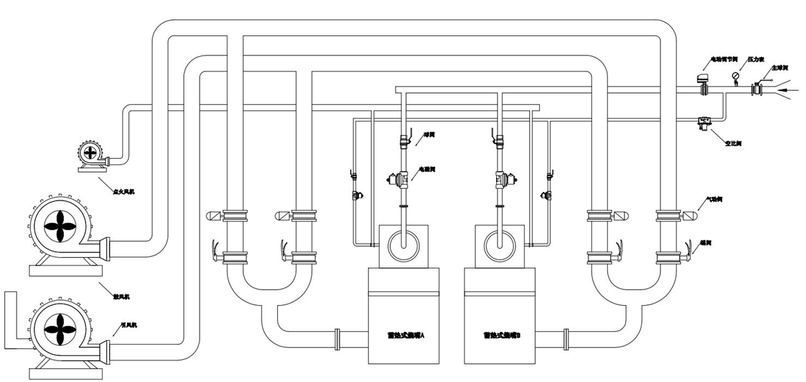 一套蓄热式烧嘴系统至少包括两个烧嘴,两个蓄热器,一个热能回收系统以及相应的控制装置。烧嘴和蓄热器可根据现场实际情况直接连接在一起或选择用耐火材料浇注的管道连接在一起。当一个烧嘴利用蓄热器里的热空气进行燃烧时,另一个烧嘴起到排烟口的功能,利用抽烟风机抽出炉子里的热空气通过烧嘴到蓄热器里进行蓄热。当热量蓄足后,换向阀动作,转换两个烧嘴的功能。每当一个烧嘴在燃烧时,则另一个在帮助蓄热器蓄热。在热交换中,管道中的废气温度通常在150-200℃,因而不管是蝶阀还是抽烟风机均能长期*可靠的工作。